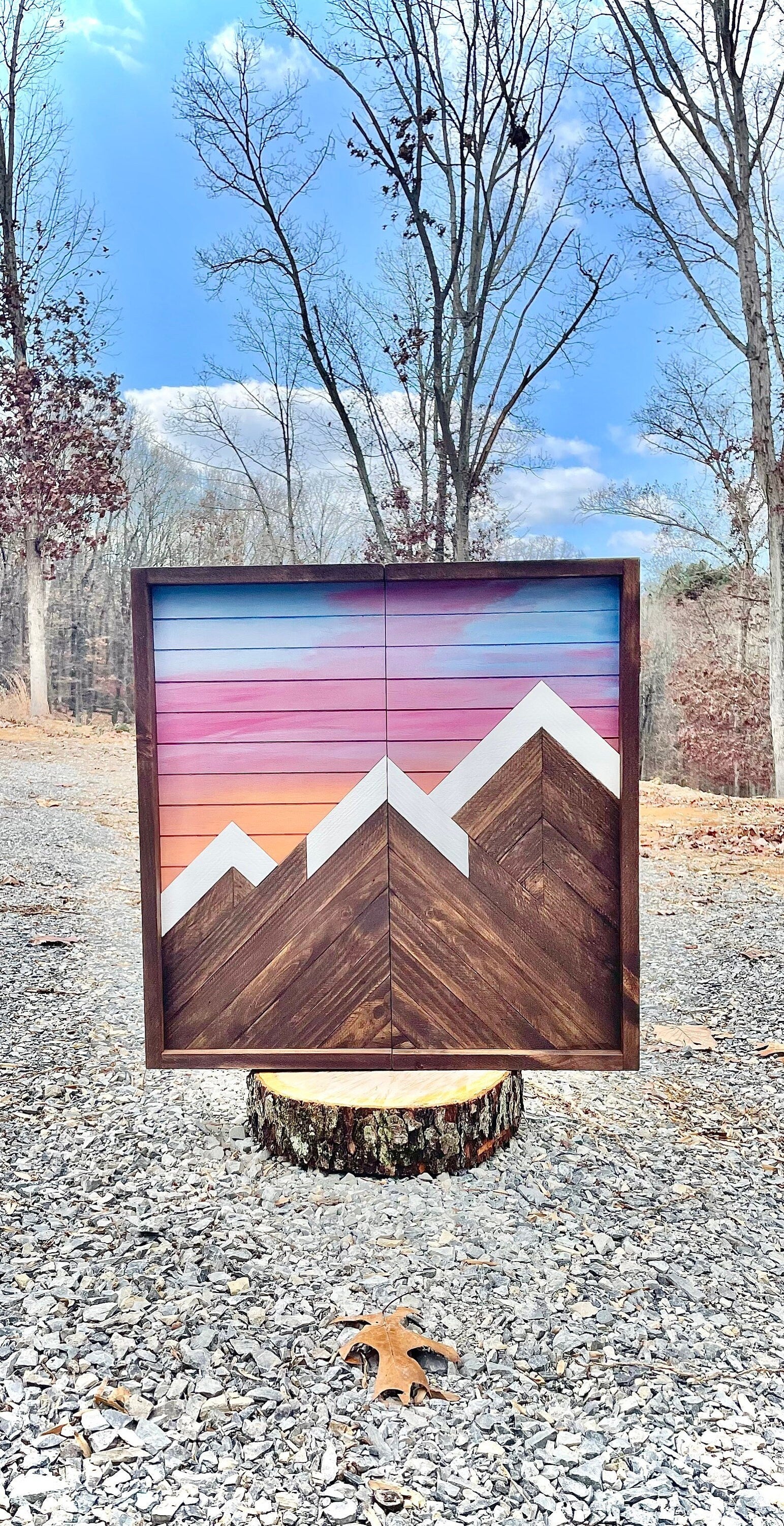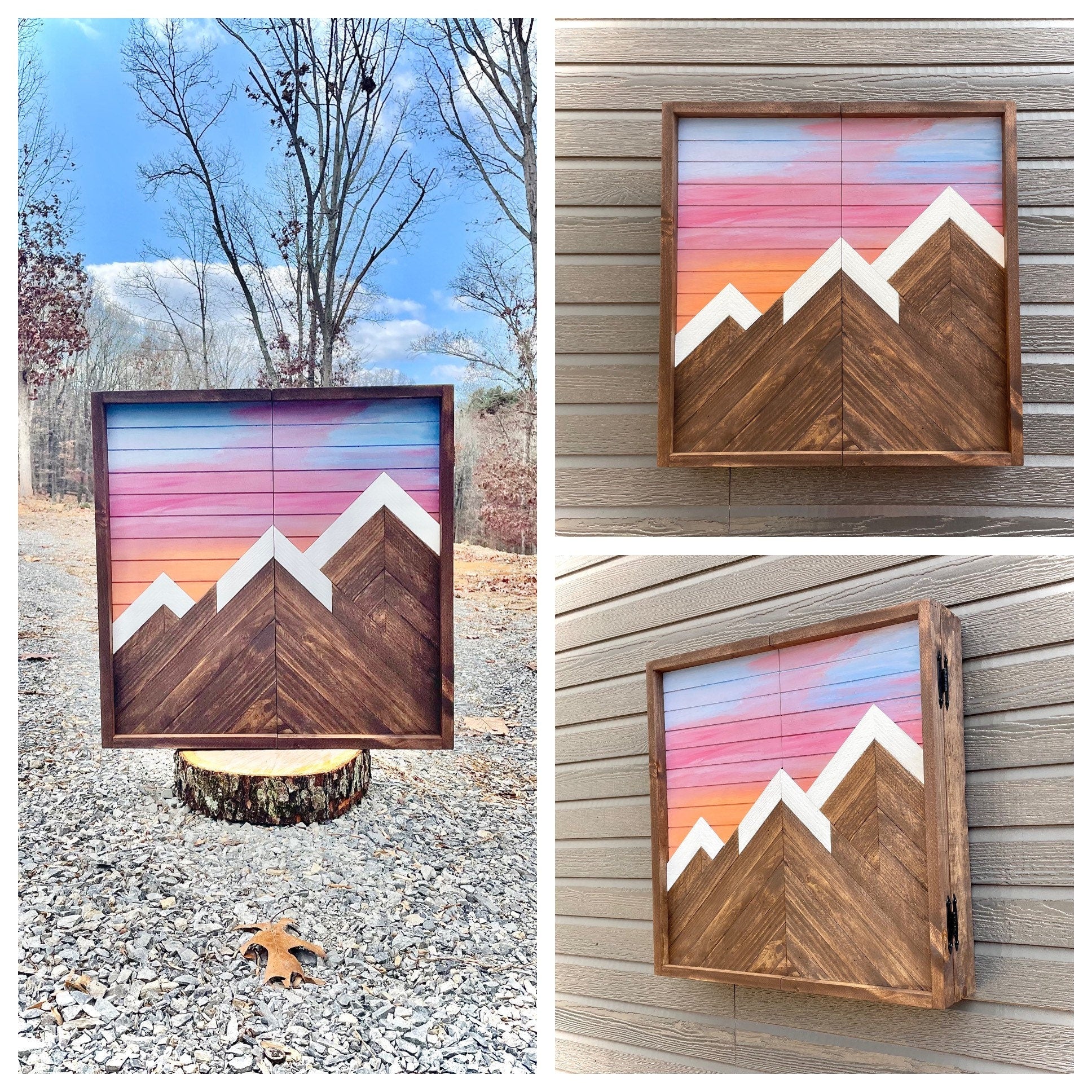 This piece is made to order. The picture displayed is the template and will be the same design but may have different wood grains. The colors of the mountain may vary based on the lath/wood used. This is a rustic piece, it will have unsanded, rough, and/or irregular markings, dimensions, and appearance.
