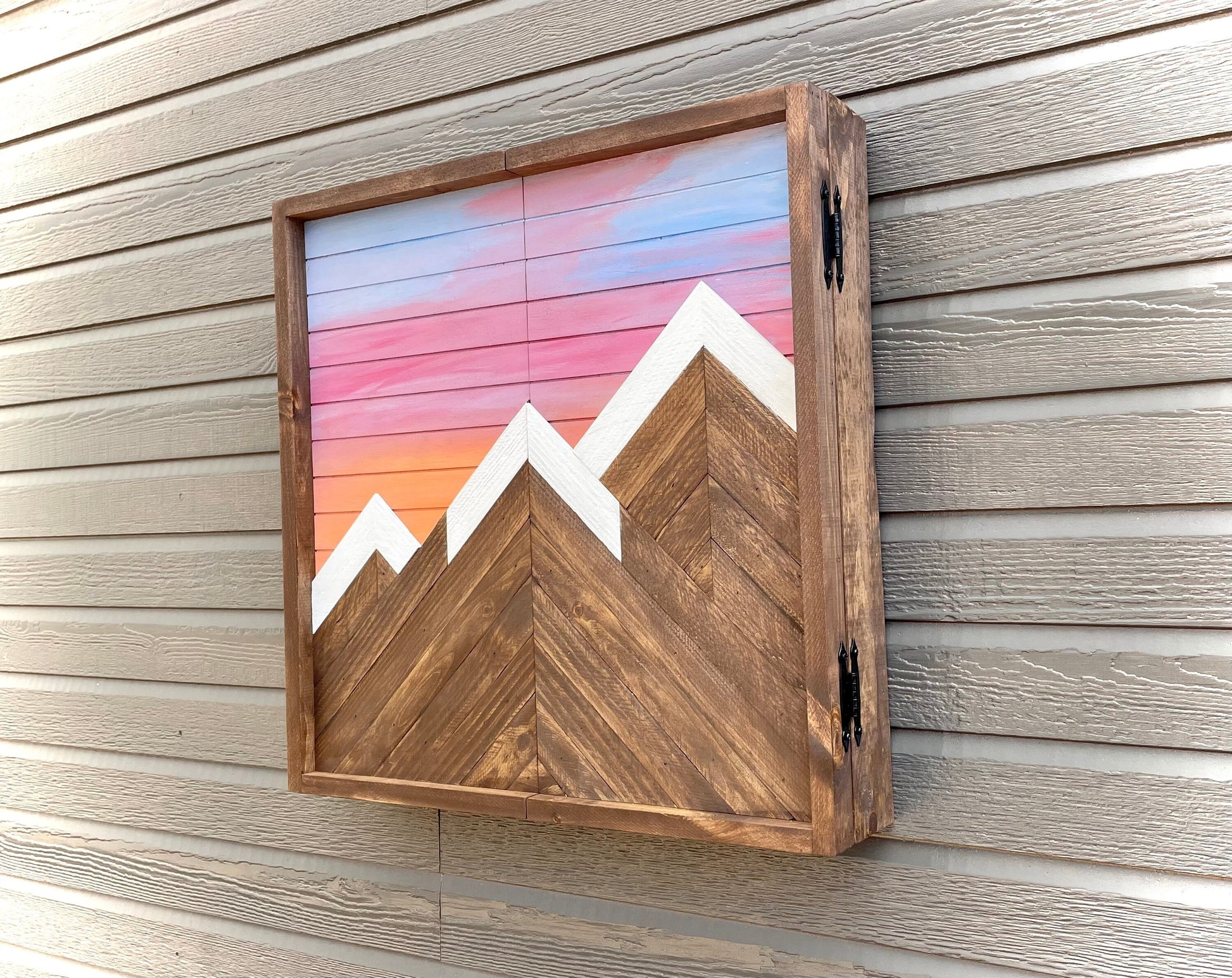 Rustic Dartboard Cabinet - Rustic Mountain Sunset-Dark Walnut Art 24”x24”- Rustic Cabinet - Game Room / Man Cave Art - Wall Decor - Cabinet