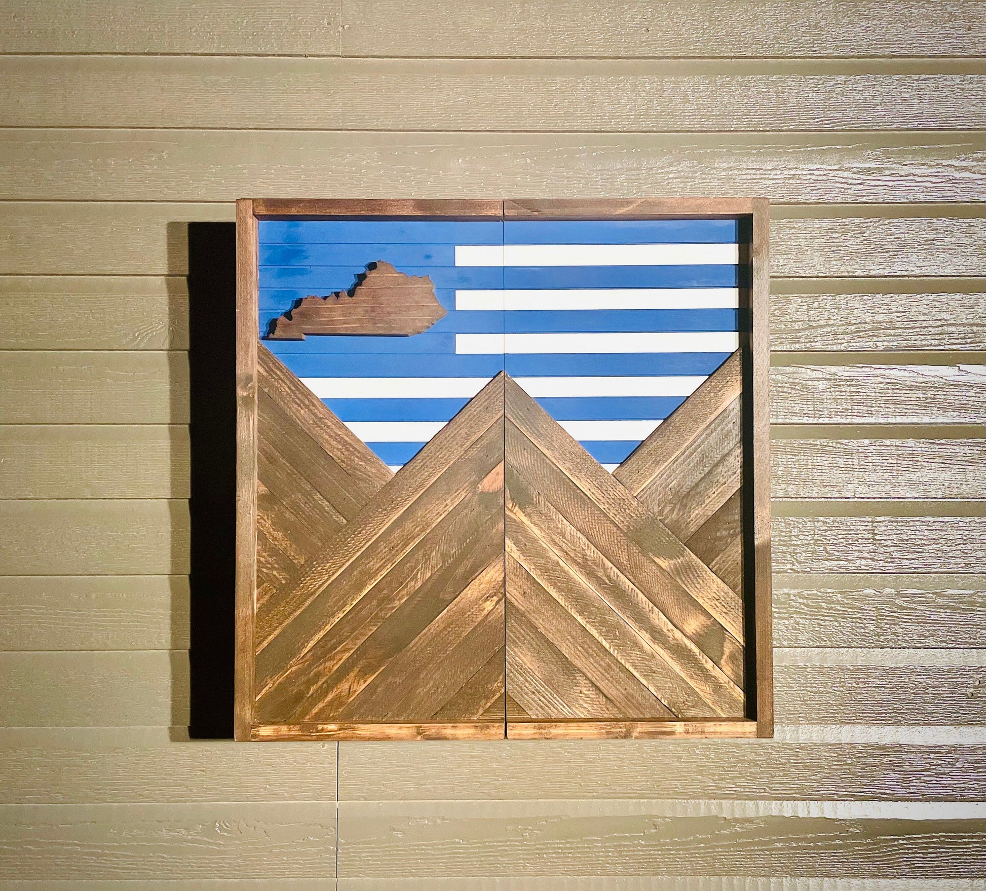 This piece is made to order. The picture displayed is the template and will be the same design but may have different wood grains. The colors of the mountain may vary based on the lath/wood used. This is a rustic piece, it will have unsanded, rough, and/or irregular markings, dimensions, and appearance.