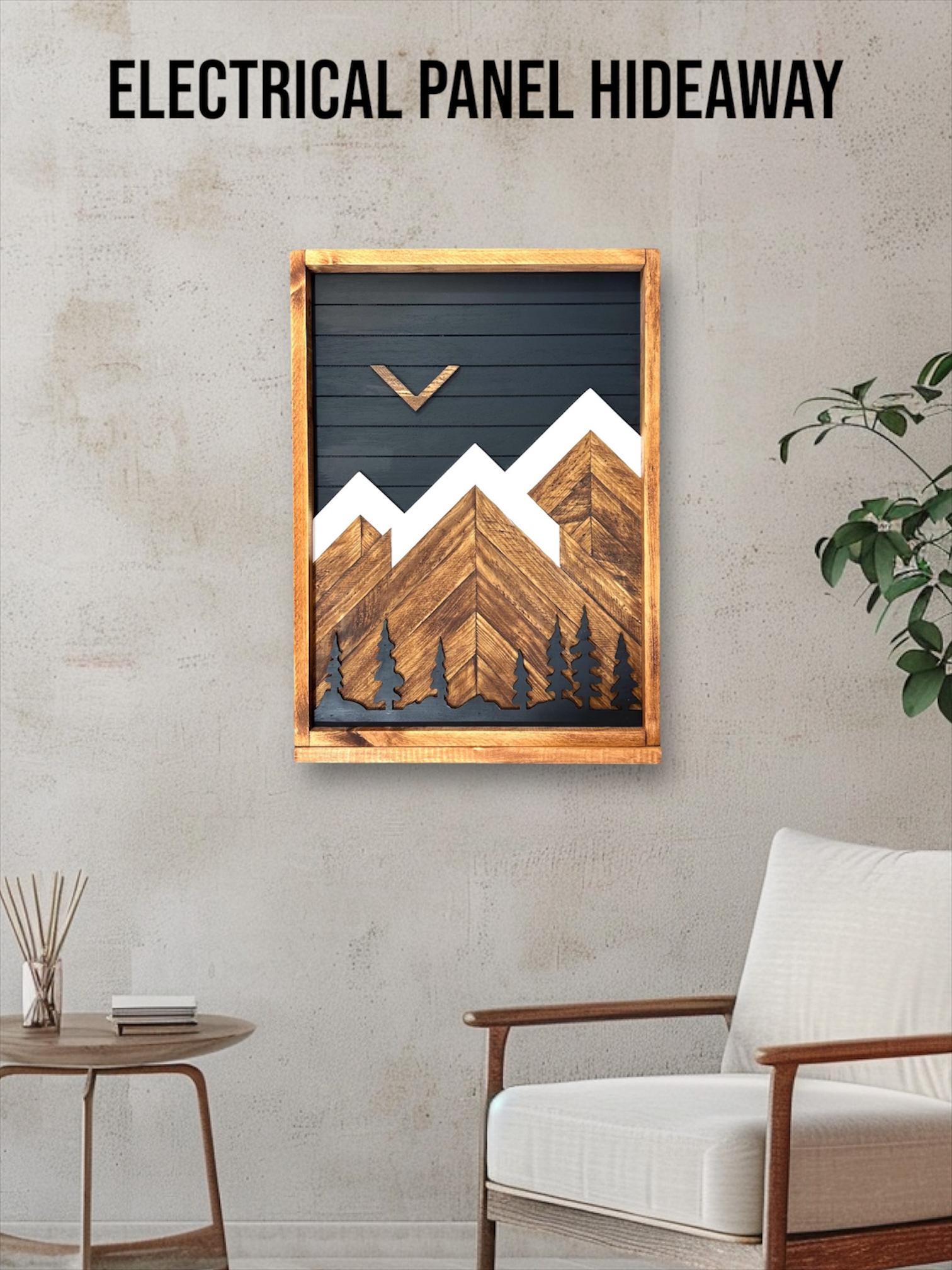 Rustic Electrical Panel Cover - Black Mountain with trees - Custom Sizes Available -Breaker Box Panel Cover - Wall Decor - Modern art